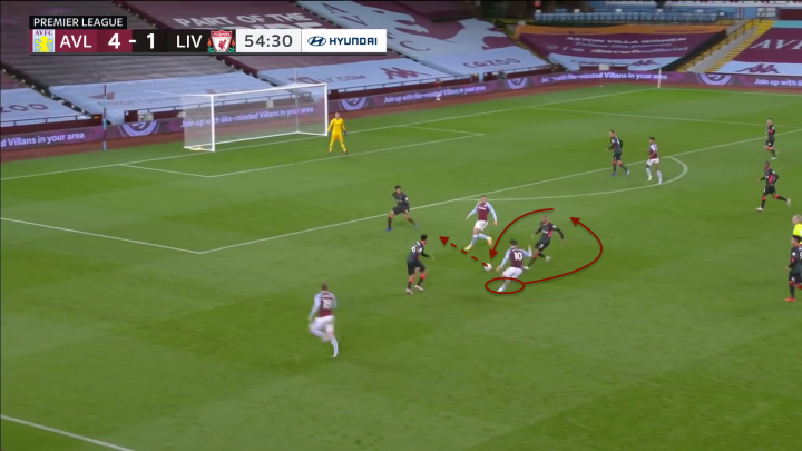 上图是维拉的一次防守反击实例,我们可以看到在防守过程中维拉前场进攻球员会大幅回撤(特拉奥雷参与到防守当中)和其他防守球员形成一个“1-3”的防守阵型;而中卫(卡什)此时则会退回到底线附近为参与拦截的球员提供了一个可能的传球选择,防止对方前场球员丢球后进行反抢。