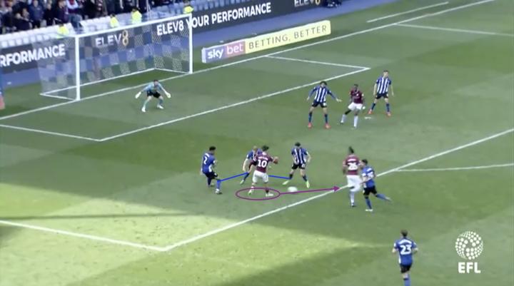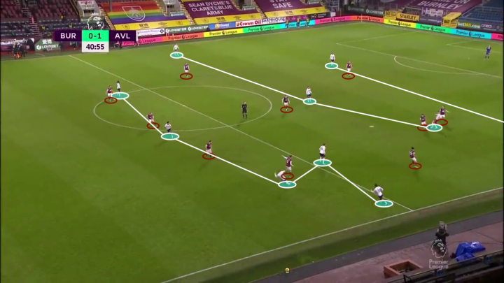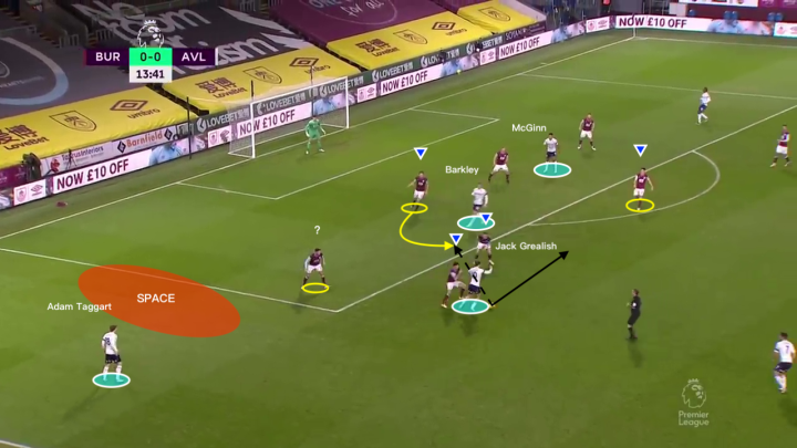 我们现在再来注意中场位置的两名球员。球队的两名边锋球员都进入到了中场位置:(格拉利什)可以为中后卫提供直传球的选择;同时,巴克利回撤后夹在后卫线和中场线之间,这使得维拉在底线位置的球员有多个选项可以用于推进进攻,一旦出现传球失误或防守失误,巴克利又可以在第一时间参与协防和抢断,夺回球权。