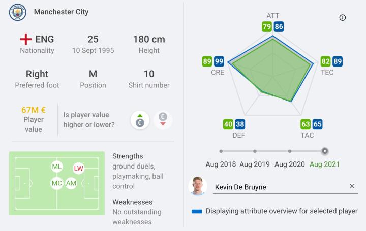球员本身出色的盘带、控球和传球水平是他的加分选项,我相信瓜迪奥拉将会把球员放在10号位或是代替斯特林的伪9号、11号位出现在球场上。当然也很难去否认瓜迪奥拉会选择将球员的位置大幅后撤,作为球队的拖后组织或全能中场出现在球场上。