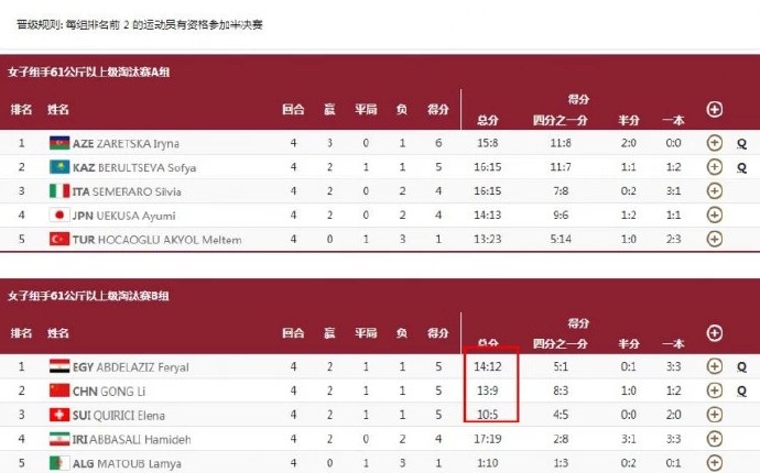 空手道女子61公斤以上级:龚莉晋级半决赛,成功锁定奖牌看镜子的人 @懂球帝2021-08-07 16:38北京时间8月7日下午,在刚刚结束的女子空手道61公斤以上级比赛中,中国选手龚莉成功晋级半决赛,成功锁定一枚奖牌。循环赛中,龚莉凭借总分13分的优势顺利晋级,以小组第二出线。由于空手道没有三四名决赛,龚莉已经确保一枚奖牌!女子61公斤以上级比赛结果半决赛将于今晚6:20进行,她的对手是A组第一的阿塞拜疆世锦赛冠军选手。展开更多