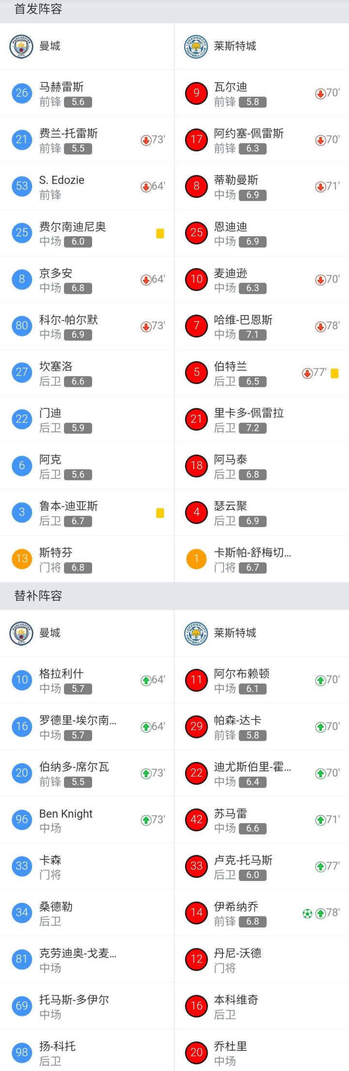莱斯特城首发:1-卡斯帕-舒梅切尔、21-里卡多-佩雷拉、18-阿马泰、4-瑟云聚、5-伯特兰(78'33-卢克-托马斯)、25-恩迪迪、8-蒂勒曼斯(71'42-苏马雷)、17-阿约塞-佩雷斯(71'11-阿尔布赖顿)、10-麦迪逊(71'22-霍尔)、7-哈维-巴恩斯(78'14-伊希纳乔)、9-瓦尔迪(71'29-达卡)