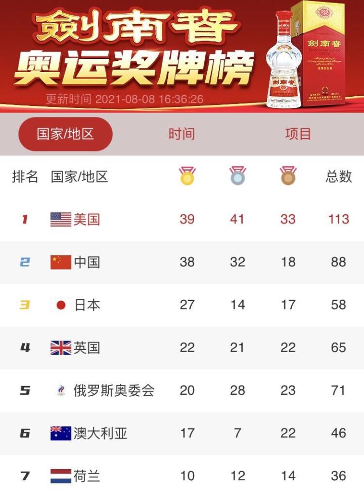 东京奥运会最终奖牌榜:美国第一,中国第二,俄奥委会第五