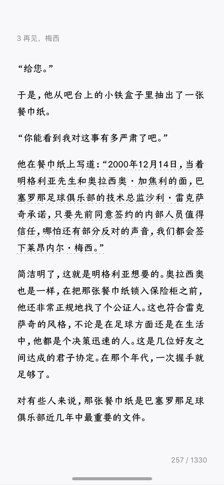 当时雷克萨奇在餐巾纸上写道:“2000年12月14日,当着明格利亚先生和奥拉西奥·加焦利的面,巴塞罗那足球俱乐部的技术总监沙利·雷克萨奇承诺,只要先前同意签约的内部人员值得信任,哪怕还有部分反对的声音,我们都会签下里奥内尔·梅西。”