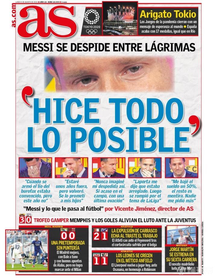 《阿斯报》:巴萨,和梅西说再见。“我做了所能做的一切。”动情的梅西在告别新闻发布会上表示,他本来已经与巴萨就续约达成一致。他告诉球迷和记者们,自己从儿时就来到巴萨,从未想过离开。职业生涯的新征程,梅西和他的妻子、孩子以及整个家庭都将面临巨变。