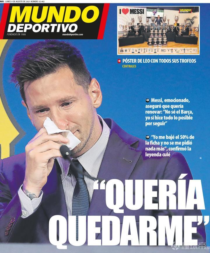 《世界体育报》:“我希望留下。”梅西在发布会上深情告别。他表示,自己为了续约做了一切努力,但很遗憾最终没能达成一致。