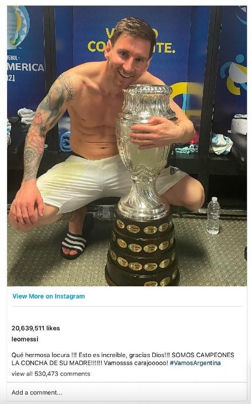 目前,梅西与美洲杯冠军奖杯的合影在Instgram上获得的点赞已经超过2000万,成为点赞数排名第一的体育类图片内容。