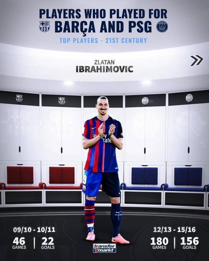 那些曾为巴萨和巴黎效力过的球员:伊布、内马尔、小罗领衔