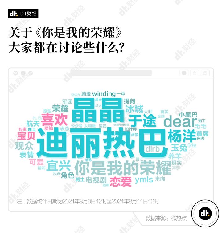 根据微热点数据,我们可以发现,关于《荣耀》这部剧,大家讨论最多的是演员迪丽热巴、杨洋和他们在剧中的角色名,其次是“喜欢、恋爱、甜蜜、爱情”等关键词。