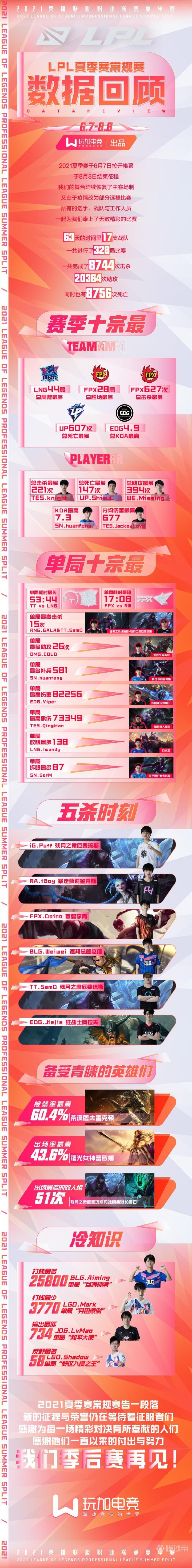 峡谷全视野英雄联盟2021LPL夏季常规赛落下帷幕,63天时间里共进行了328局比赛,而数据记录下了各战队与选手无数的精彩瞬间。