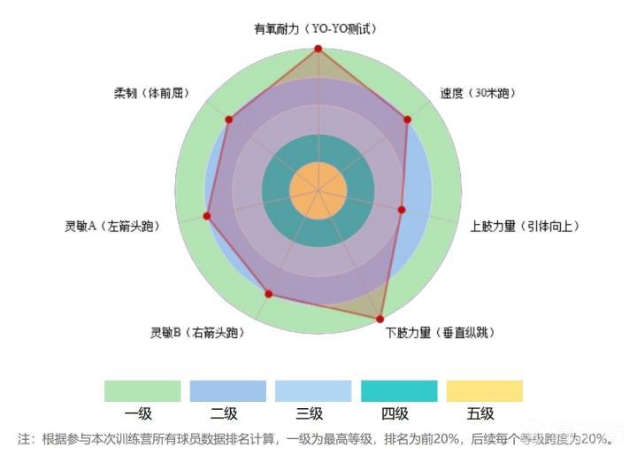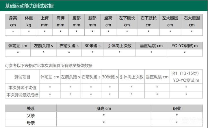 每一位参加精英青少年训练营的球员,都会收到一份详细的个人数据追踪报告。包括整体评价、建议、五环能力测评、各项基础运动能力测试数据、运动伤病统计等方面,全部都有记录。个人数据追踪报告也为球员后续针对性的训练和提升提供了可量化参考。