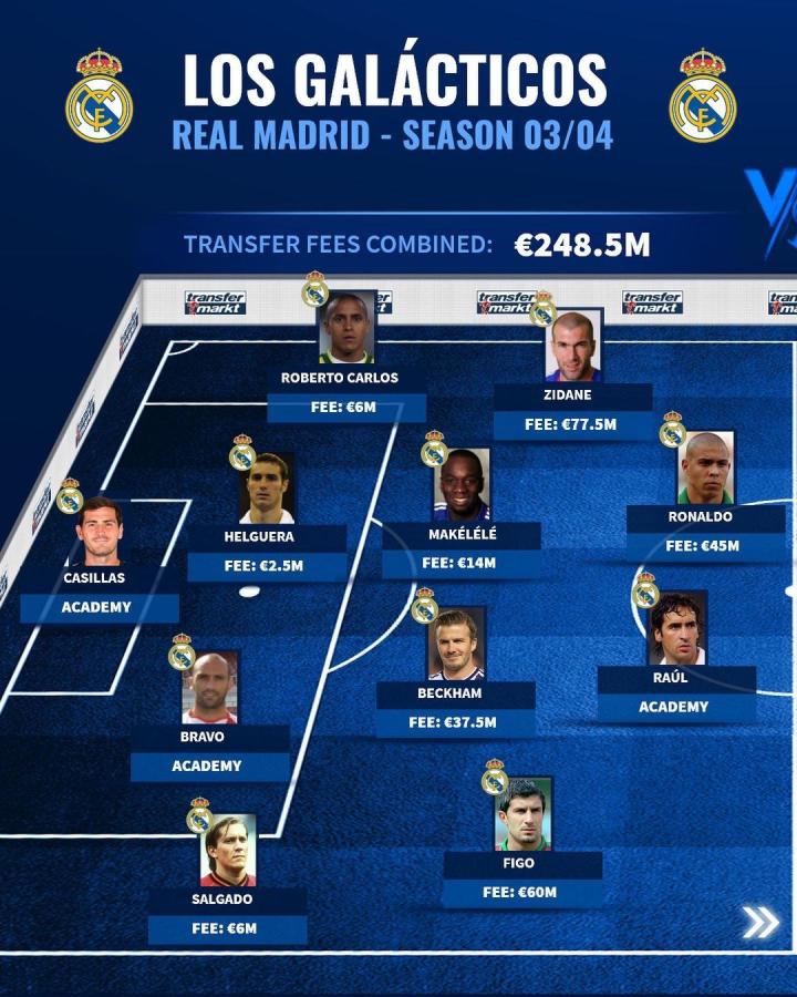 皇马的这套阵容总转会费为2.485亿欧元,当时齐达内的转会费高达7750万欧元,菲戈为6000万欧元,罗纳尔多为4500万欧元,贝克汉姆为3750万欧元。皇马阵中同时也有劳尔、卡西、布拉沃这样的自家青训球员。