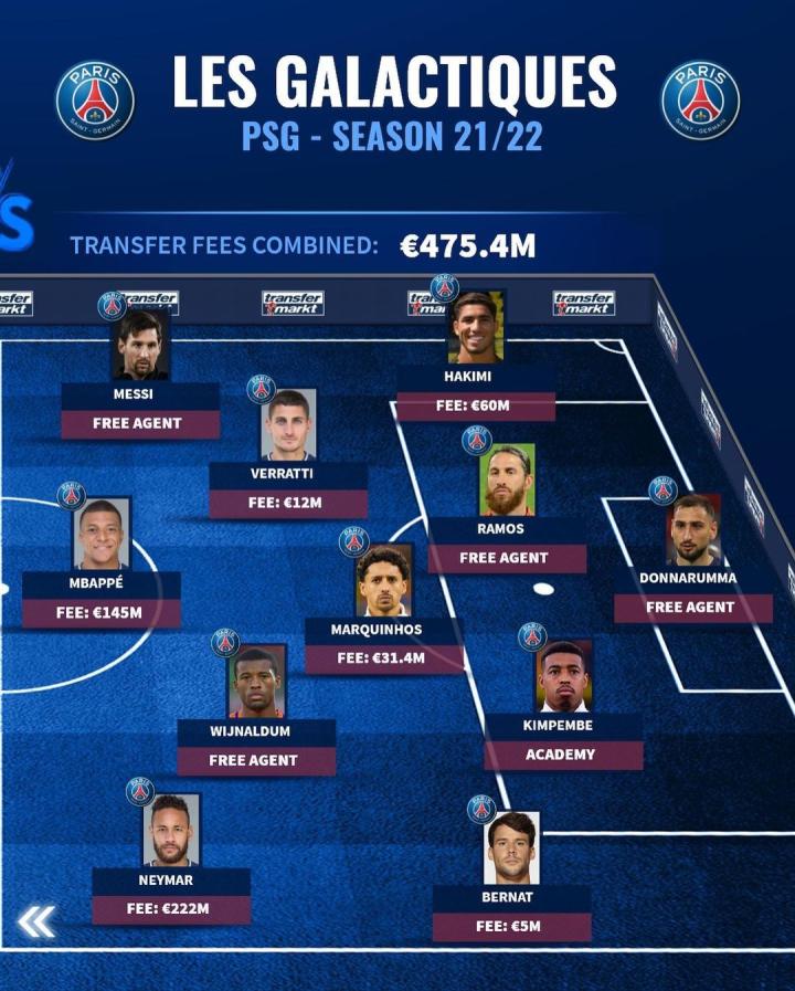 自梅西、拉莫斯、多纳鲁马等强援加盟后,本就拥有内马尔、姆巴佩等球星的巴黎阵容变得更加星光熠熠。德国媒体“转会市场”列出了皇马2003/04赛季的阵容与巴黎新赛季的阵容,这两队的阵容都可称得上是“银河战舰”。