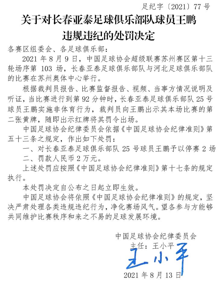关于对长春亚泰足球俱乐部队球员王鹏违规违纪的处罚...shizhenguan @懂球帝2021-08-13 15:44关于对长春亚泰足球俱乐部队球员王鹏违规违纪的处罚决定 长春亚泰球员王鹏因为非体育行为,被停赛2场,罚款2万。展开更多