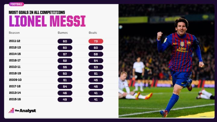 梅西单赛季进球排行:最多曾在11/12赛季打进73球