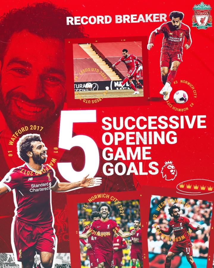 自2017年夏天加盟利物浦重返英超以来,萨拉赫在过去四个赛季英超首轮比赛中均取得进球。2017年对阵沃特福德,2018年对阵西汉姆联,2019年对阵诺维奇以及2020年对阵利兹联。