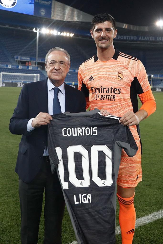 在皇马4-1击败阿拉维斯的比赛中,库尔图瓦完成了皇马生涯西甲百场,赛后他从主席弗洛伦蒂诺手中获得了纪念球衣。