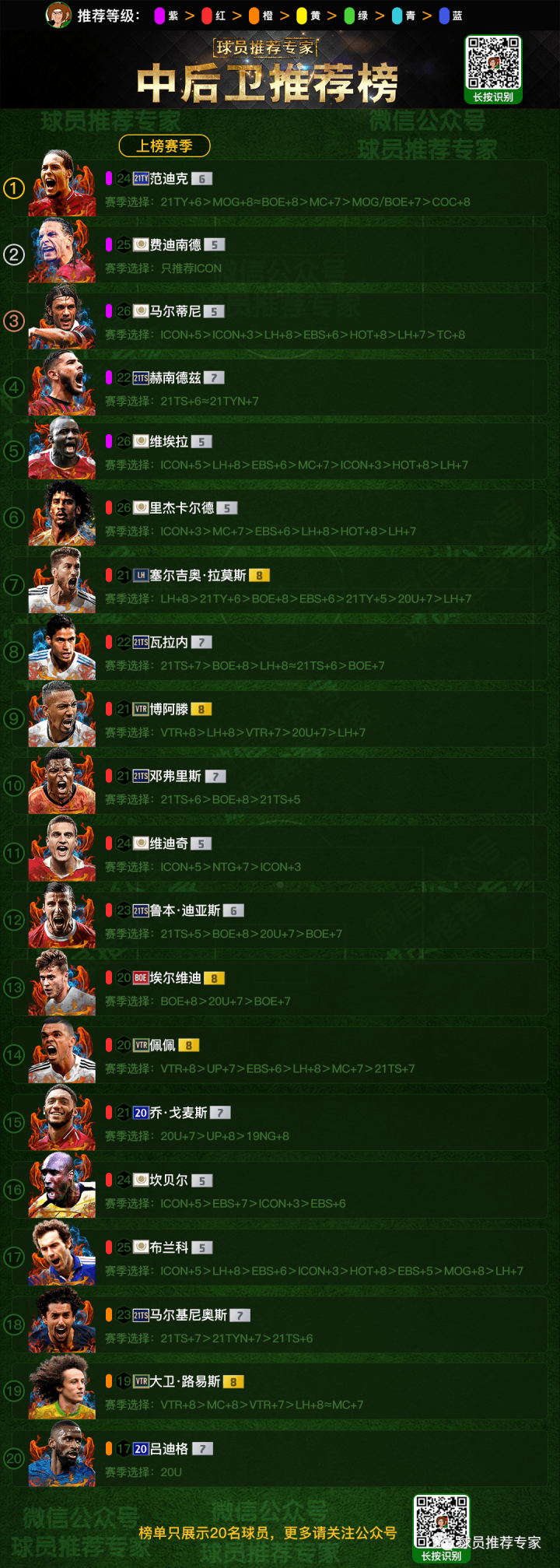 范迪克可以说是毫无疑问的独一档的存在,但就像“内马尔6星花式是因为他配得上,小罗6星花式是因为最高只有6星”一个道理,马尔蒂尼、费迪南德等紫级是因为他们配得上紫级,而范迪克紫级是因为最高只有紫级。范迪克是真正意义上完美无瑕的极品中卫,模型劲爆不提,速度还能如此之快,速度快就算了,这么高大还这么灵活,这么灵活就算了,AI还如此之高,使其防守选位非常合理,AI如此之高就算了,身体对抗还这么强,弹跳又好,防空无解。真的想挑毛病都挑不出啊!赛季选择方面基本每一个赛季的范迪克都很棒,具体强化到几级就看各自的经济情况了。