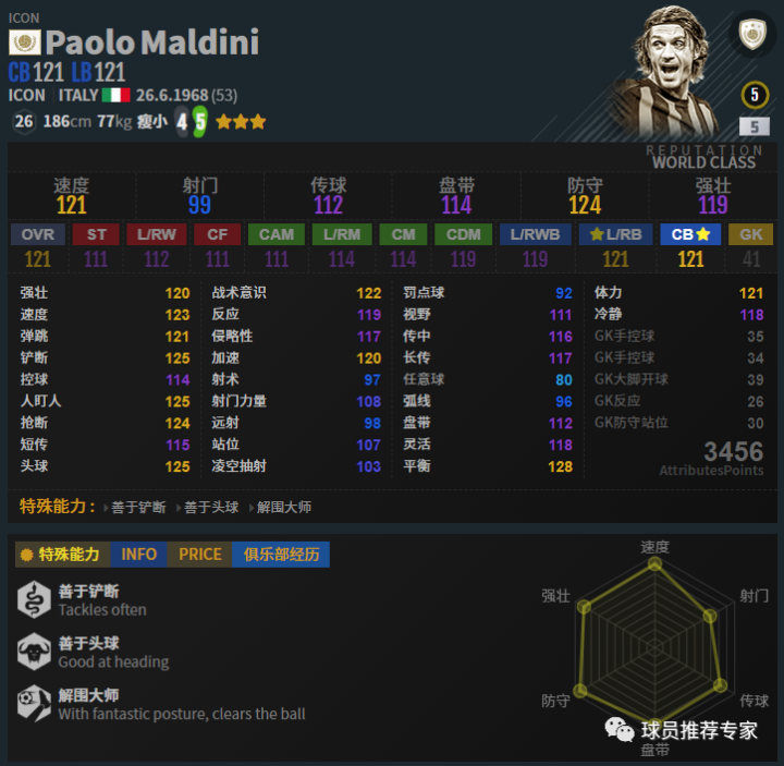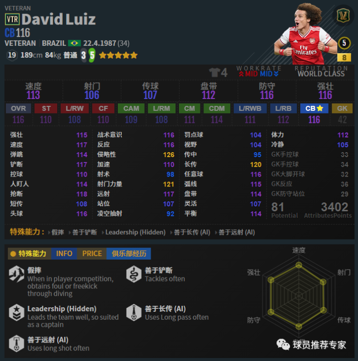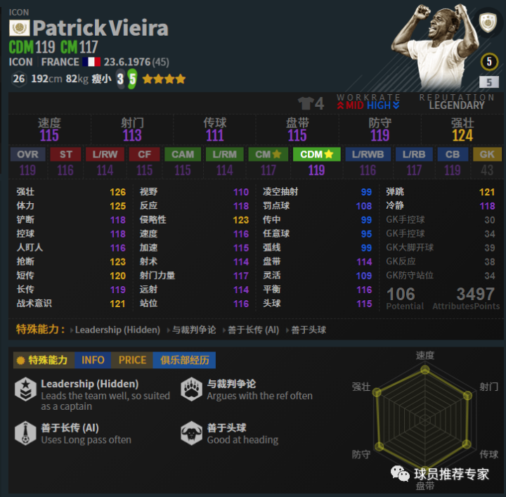 虽然大家以往的印象中维埃拉一般是打后腰或者中前卫的,但是目前游戏里维埃拉打中卫是非常不错的,甚至略好于后腰位置。因为防守方面非常强力,ICON维埃拉与中卫位置非常契合。抢断非常给力,大长腿一伸直接断球,配合助教“顶牛”和“盘蛇”,让其在中卫位置犹如bug般存在。赛季选择方面如果搞不到ICON银卡,那么LH、EBS和MC的高强也是不错的选择。