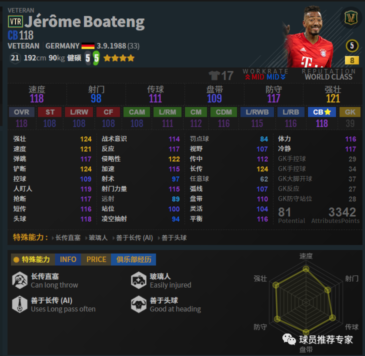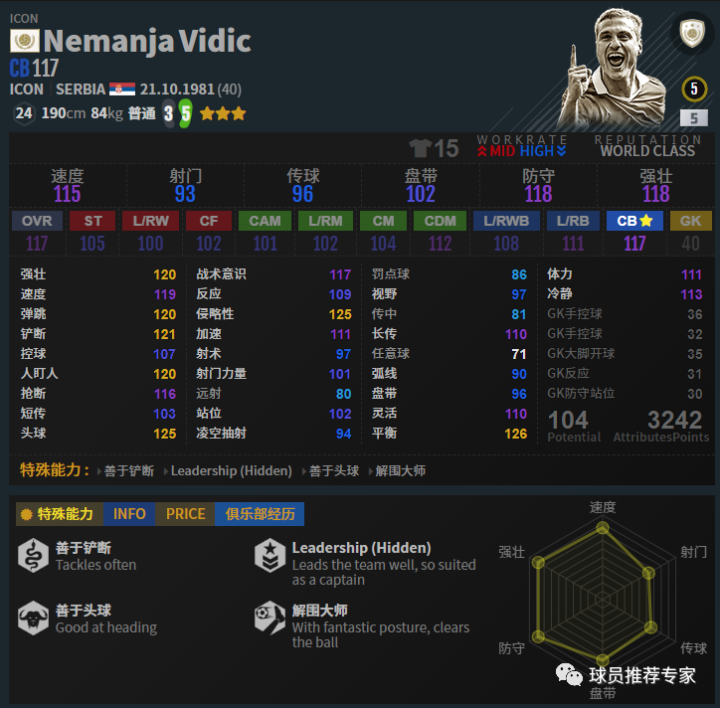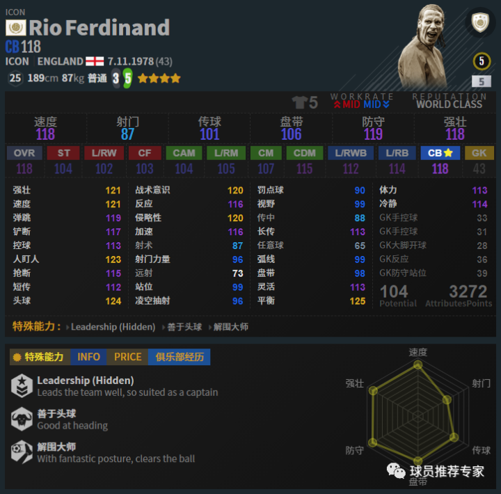 “无解费电男”费迪南德也是趋近完美的一名中卫,无论是上抢还是补位回追都十分给力。身体对抗更是变态级别,基本没有多少进攻球员可以在他身上占到便宜,甚至让人望而生畏,给对手的压力很大,威压十足。看到费迪南德还是绕开吧,过是过不去的。赛季选择方面目前只推荐ICON赛季,其他赛季比ICON确实差不少。