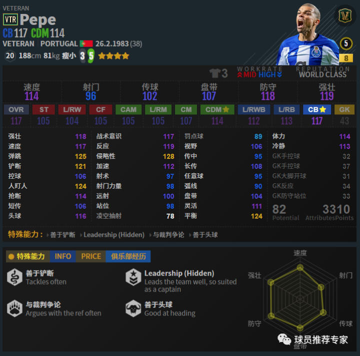 佩佩是一名很强的中卫。别看瘦弱体型,身体对抗可一点不弱,非常硬。速度也有,灵活平衡都很高,特别是上抢尤为给力。AI很高,防守非常稳健,滴水不漏,有大师风范。赛季选择方面最好的肯定是UP赛季,但是VT赛季目前开发了金卡,有金卡肯定选VT金卡,如果不行选UP7卡也是不错的。