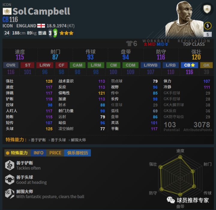 坎贝尔身强体壮,只要碰到基本没了,速度也有,就是灵活低了点,转身比较慢,但综合来说还是一名优秀的中卫。赛季选择方面如果有条件尽量ICON上银,EBS高强也可以用。
