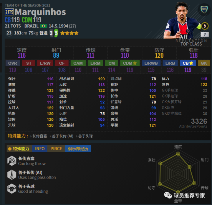 马尔基尼奥斯的AI很高,防守位置感非常好,非常聪明的一名中卫。虽然模型一般,体重稍轻,但是抢断很聪明,经常出现在关键位置将球破坏,防守很稳健。速度方面也还可以,因为转身很快且很少失位,所以一般反击也不会被打穿。赛季选择方面2T1S和21TYN都是不错的选择。