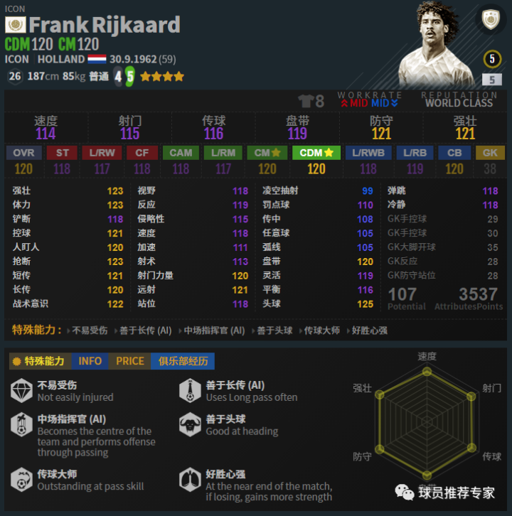 里杰卡尔德确实太全面了,中卫、中场、后腰都有他的身影,而且还都是顶级。当然这里上榜的是ICON里杰的银卡,如果不是的话,那么其他赛季的里杰是没有那么强力的,排名会掉不少。但是ICON里杰做的确实太强力了,让其中场、后腰位置都达到了紫级,中卫也接近紫级,真心变态。其他赛季大概只能红级中游,但红级以上都算是游戏内最顶尖的选手了。