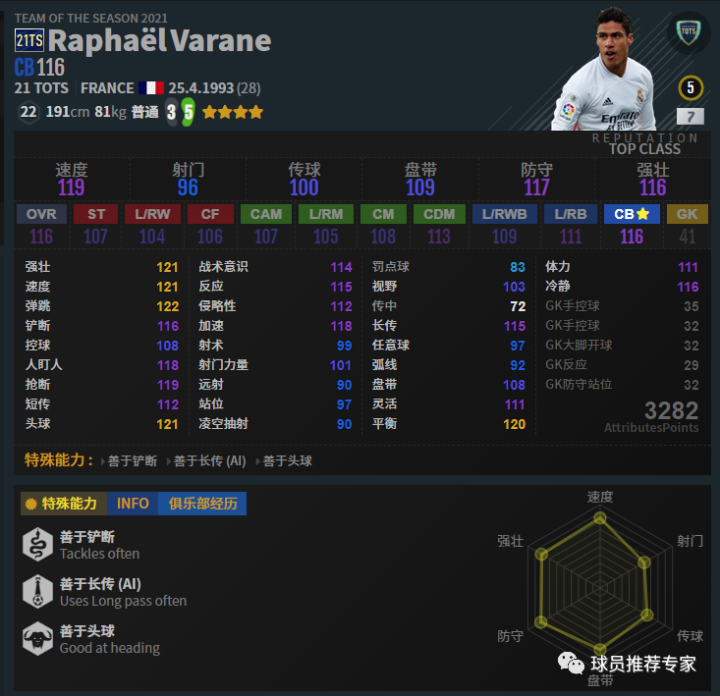 21TS瓦拉内一般来说强化到7卡就非常不错了。没能更进一步也只是因为强化等级问题。瓦拉内的回追是非常恐怖的,有时候就算是一些你觉得不可能的球也给你追回来。对抗方面看起来好像一般,但实际上并不差。81KG的体重加普通体型足以应付绝大多数的身体对抗。更难能可贵的是瓦拉内转身很快,回追这方面几乎是无解的。虽然说现在直塞很流行,但是遇到瓦拉内打直塞是会吃瘪的。赛季选择方面21TS、20TS肯定是最好的,接着BOE和LH也是不错的选择。