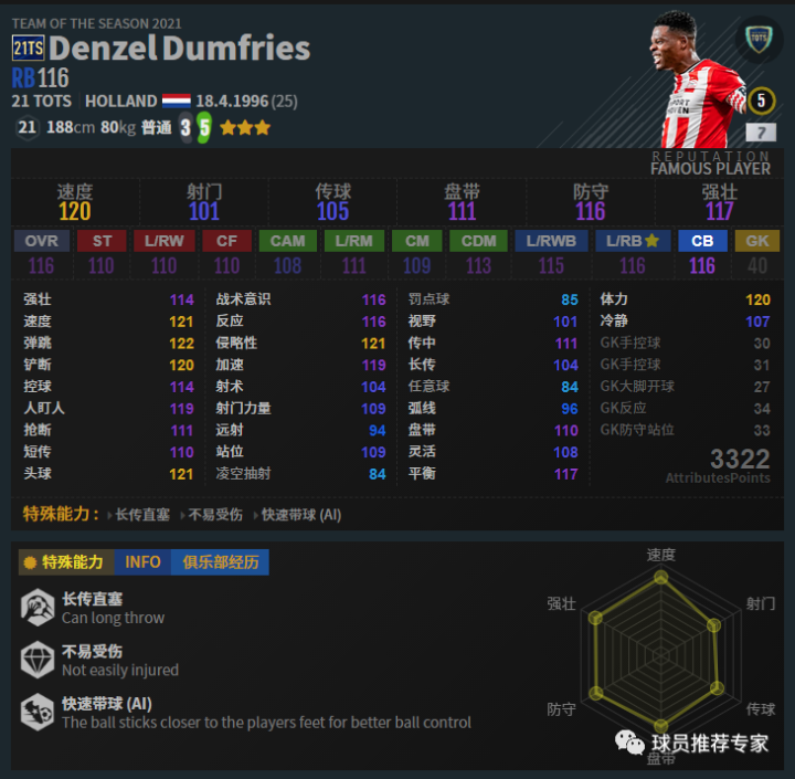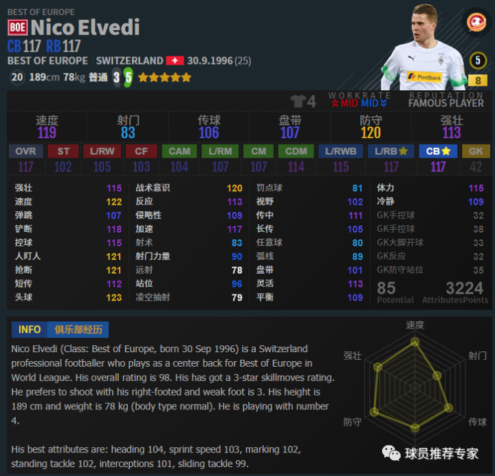 邓弗里斯虽然官方定位是一名边后卫,但其实完全可以拿他来打中卫,甚至比边后卫更强。打中卫邓弗里斯的灵活还可以接受,但是作为边后卫的话邓弗里斯的灵活就显得有点低了。而且速度方面作为中卫来说优势是比较大的,但是作为边后卫这速度优势不算很大。而且这个邓弗里斯传中也不算很高,综合来说作为中卫是更合适的。当然邓弗里斯打边后卫红级也是没问题的。中卫和边后卫邓弗里斯都是非常完美的人选。