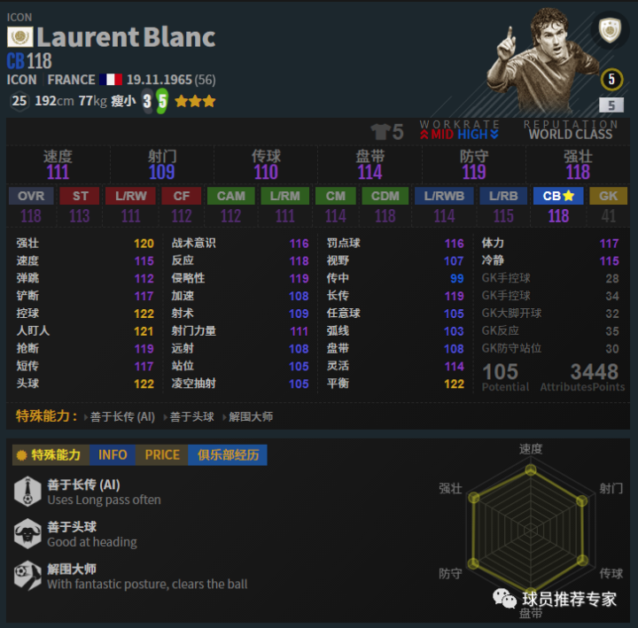 布兰克后腰和中卫位置都能胜任。不过ICON布兰克双速给的慢了点,确实是比较无奈的。模型总体来说偏瘦一些,但是身体对抗能力还是可以的。腿很长,抢断给力。赛季选择方面如果嫌ICON工资太高,LH金卡也是可以用的。平民的话LH和EBS银卡都可以选择。