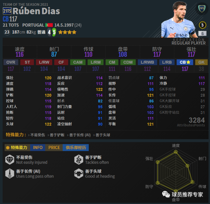 鲁本·迪亚斯是一名综合能力全面的中卫。187,82的模型绝对是OK的,回追速度也不赖,身体对抗方面也还可以,且灵活不低,综合来说确实蛮全面的,甚至可以客串后腰位置。赛季选择方面21TS是目前最推荐的,其次BOE和20U高强也是可以用的。