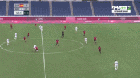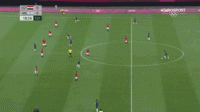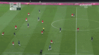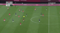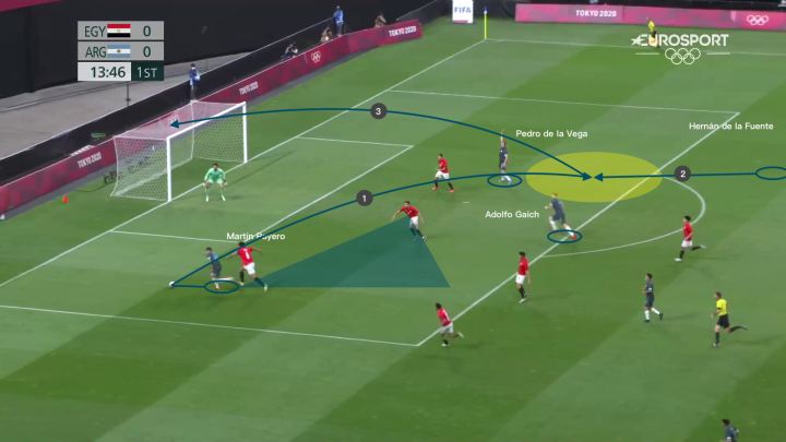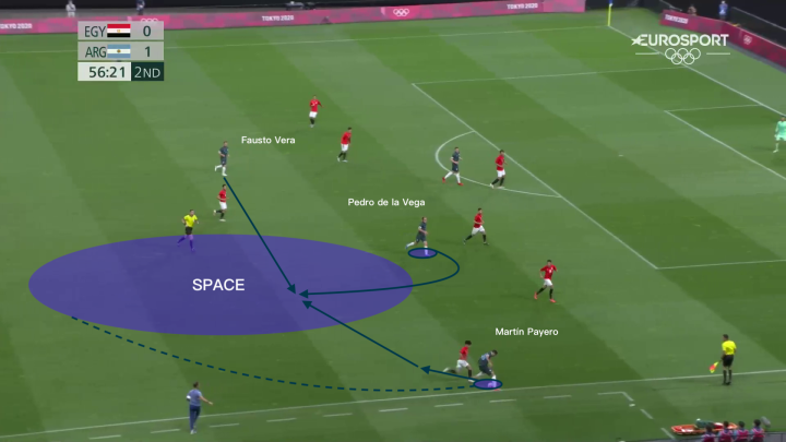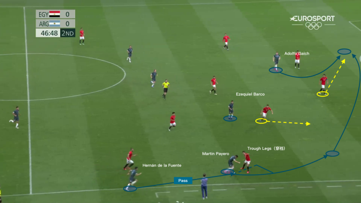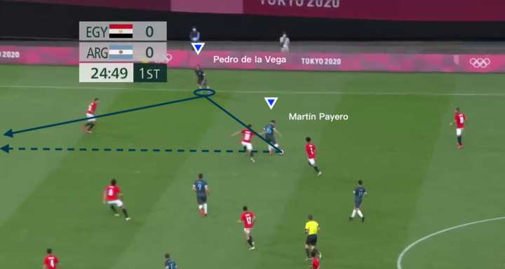 上图所展示的是帕耶罗在奥运会期间,面对埃及国奥队的一次成功的过人尝试,在边路拿到皮球1v1面对对方边位的情况下,他选择了直接人球分过来利用对方球员后方大片的空档区域;在完成穿裆过人后,他一路带球来到禁区边缘为中路送出弧线球传中。