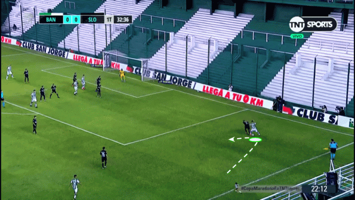 当有多名球员在边路参与进攻时,帕耶罗会更愿意通过在中路偏右的位置和队友形成简单的二过一或套边配合,但是当他进入到底线位置时会通过速度和变向去晃开防守队员(完成传中或是将球回做给跟进的中路球员)。在下图的例子中我们可以看到帕耶罗通过拉球,甩开紧逼的边卫球员为自己和队友制造可能的传球空间,将中场区域的空档区域最大化利用起来。在第二张图中,我们可以看到球员在底线位置会利用身体顶开防守球员,以创造他所需要的空间,完成突破进入到禁区当中。