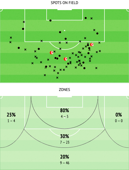 [图]球员的远射能力很强,颇有南美球员的风范过了中场就来上一脚。球员的射门集中在中路区域,也可以更好的佐证前文对于帕耶罗边路打法的介绍