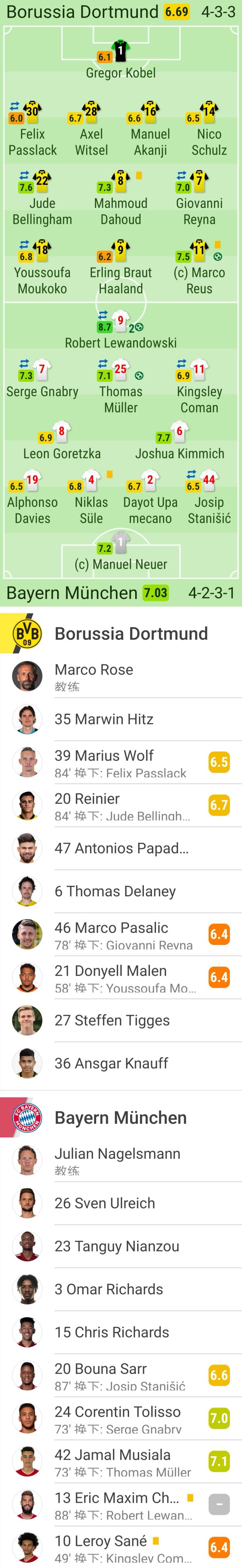 多特蒙德首发:1-格雷戈-科贝尔、30-帕斯拉克(83'39-马里乌斯-沃尔夫)、28-维特塞尔、16-阿坎吉、14-舒尔茨、8-达胡德、22-贝林厄姆(83'20-雷尼尔-热苏斯)、7-雷纳(77'46-帕萨利奇)、11-罗伊斯、18-穆科科(57'21-马伦)、9-哈兰德