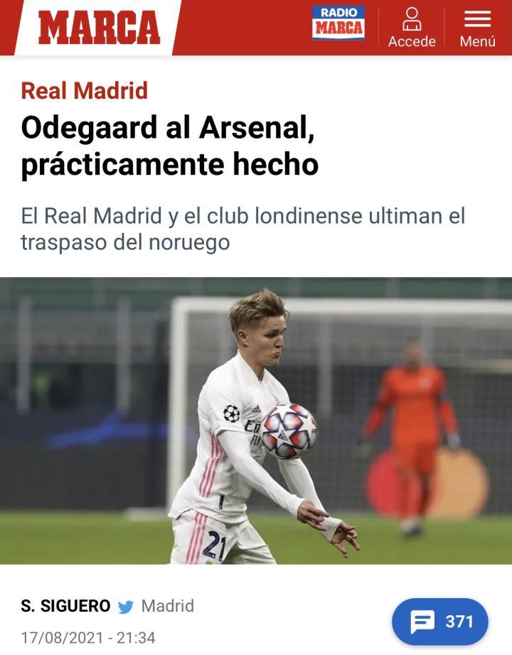 来自《马卡报》的报道,皇马中场球员马丁-厄德高即将重返阿森纳,阿森纳和皇家马德里正在进行最后的讨论。