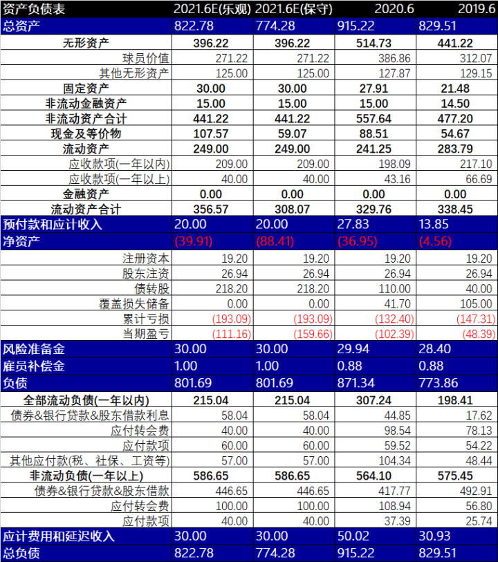 流动负债包括了银行贷款和各种债务的利息、应付转会费、应付款(对供应商的)和应付薪酬等,可以说这部分每年2个多亿的现金支出是刚性的。20赛季流动负债增加了1个多亿主要是新增了2500万的银行借款,这部分应该是可以每年借新还旧的,另外还有应付转会费增加了2000万,最大头是应付员工薪酬增加了5600万,因为20赛季延长到8月份才结束,所以20赛季的部分工资是记在流动负债下面。21赛季