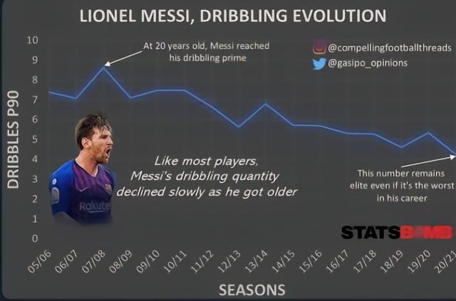 今年6月份年满34岁的梅西上赛季依然可以做出4次过人。