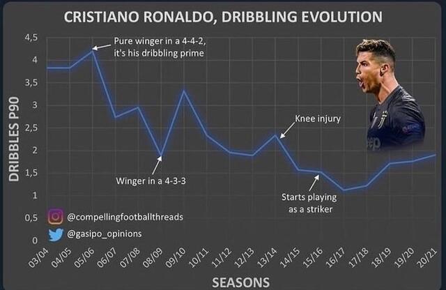 从大约2014年开始,C罗每90分钟的过人次数不到2次。当然,这和他踢的位置和球队阵型有很大关系。