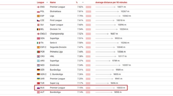 如果我们只评估各联赛平均跑动距离,那么俄超排在第 13 位(10,033 米)——在西班牙甲级联赛和捷克甲级联赛之间。