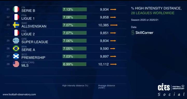 国际体育研究中心 (CIES) 根据技能角实验室的数据,公布了世界上最激烈的锦标赛排名。它囊括了28个联赛,其中包括英格兰、西班牙、意大利、德国和法国的乙级联赛,以及美职联和两个南美联赛——阿根廷超级联赛和巴西甲级联赛,赛制为“春秋两季”。 ”)。