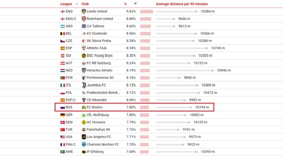 在俄超联赛中,罗斯托夫表现出了最好的强度。在卡尔平的领导下,罗斯托夫队以消耗能量的方式来为对手制造压力作为主要打法,CIES的数据证实了这一点——他们的强度数值为 7.80%。德甲强度最大的球队沃尔夫斯堡,和这个数值也一模一样。