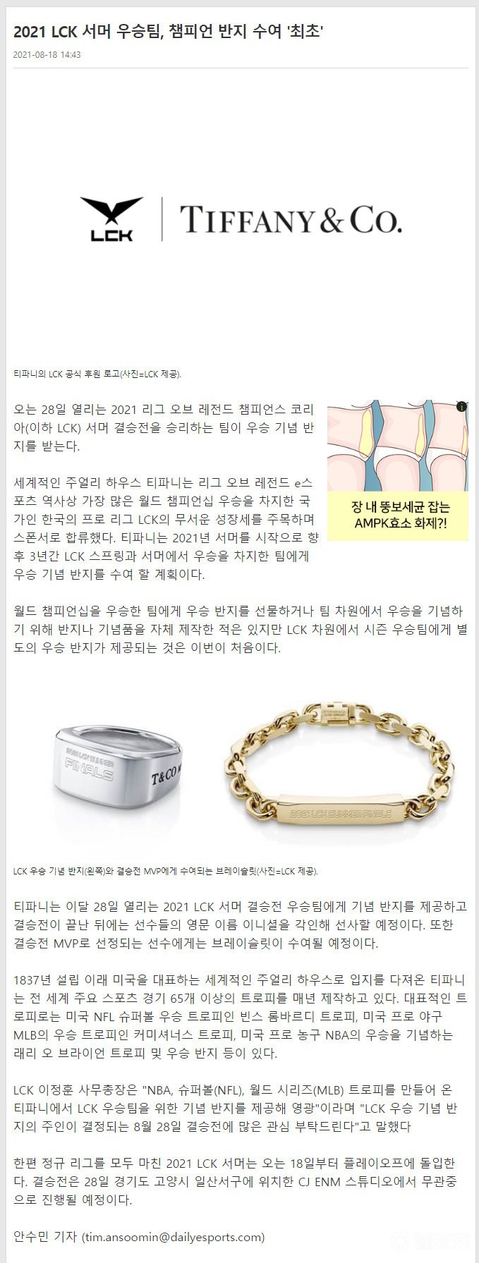 珠宝品牌Tiffany与LCK合作:将为LCK定制冠军戒指和MVP手链