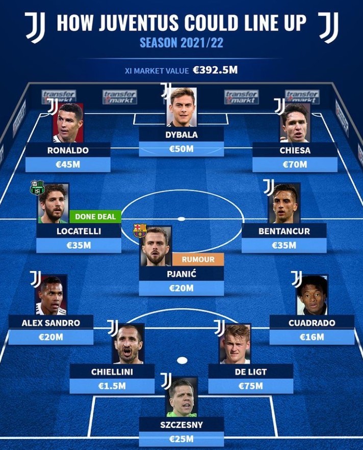德转列尤文新赛季阵容:C罗、迪巴拉、德利赫特领衔萌匪 @懂球帝2021-08-19 19:45德国媒体“转会市场”为尤文图斯列出了新赛季的阵容:由C罗、迪巴拉、小基耶萨、德利赫特等人领衔。图片来源:转会市场德转列尤文新赛季阵容前锋:C罗 迪巴拉 基耶萨中场:洛卡特利 皮亚尼奇 本坦库尔后卫:桑德罗 基耶利尼 德利赫特 夸德拉多门将:什琴斯尼(注:有传闻说皮亚尼奇会重返尤文,他目前仍是巴萨球员)展开更多