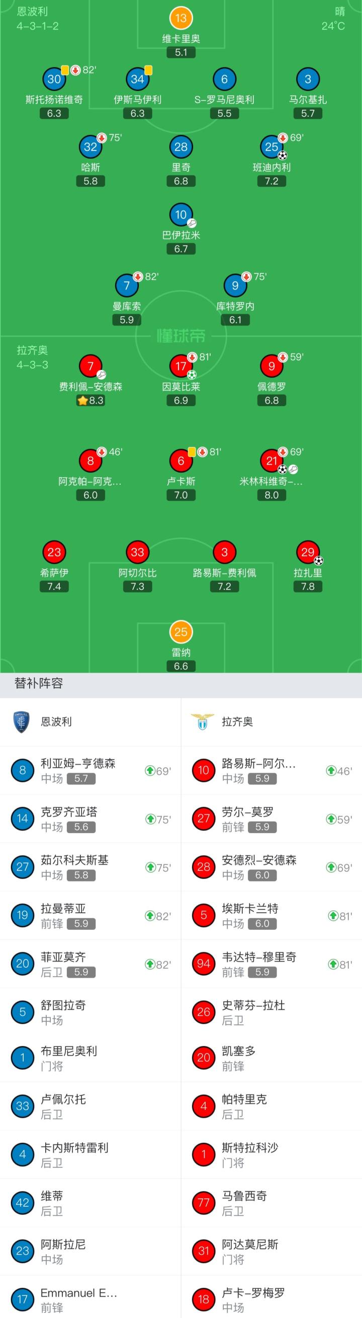 拉齐奥首发:25-雷纳、23-希萨伊、33-阿切尔比、3-路易斯-费利佩、29-拉扎里、8-阿克帕-阿克普罗(46'10-路易斯-阿尔贝托)、6-卢卡斯(81'5-埃斯卡兰特)、21-米林科维奇(69'28-安德烈-安德森)、9-佩德罗(59'27-劳尔-莫罗)、17-因莫比莱(81'94-韦达特-穆里奇)、7-费利佩-安德森