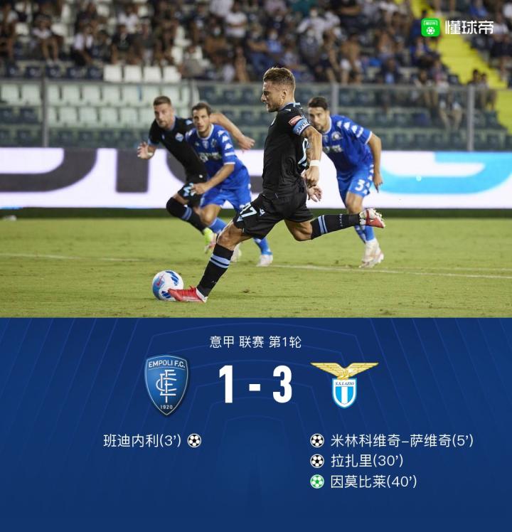 北京时间8月22日2:45,意甲第1轮,拉齐奥客场挑战恩波利。上半场,班迪内利抽射破门,安德森助攻米林科维奇快速将比分扳平,拉扎里低射建功,阿切尔比造点,因莫比莱点射。下半场,路易斯-费利佩门线救险,安德烈-安德森小角度打门偏出,最终,拉齐奥3-1恩波利迎联赛开门红。