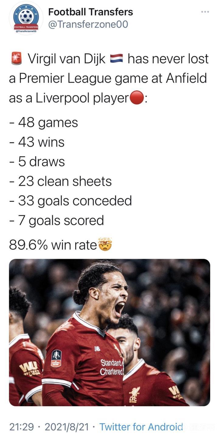 维吉尔·范戴克,作为利物浦球员,从未在安菲尔德输...足球放送 @懂球帝2021-08-22 11:22维吉尔·范戴克,作为利物浦球员,从未在安菲尔德输过一场英超比赛: - 48场比赛 - 43 胜 - 5 平 - 23 不失球场次 - 33 球队丢球数 - 7 范戴克进球 89.6% 胜率展开更多