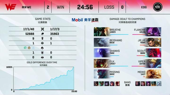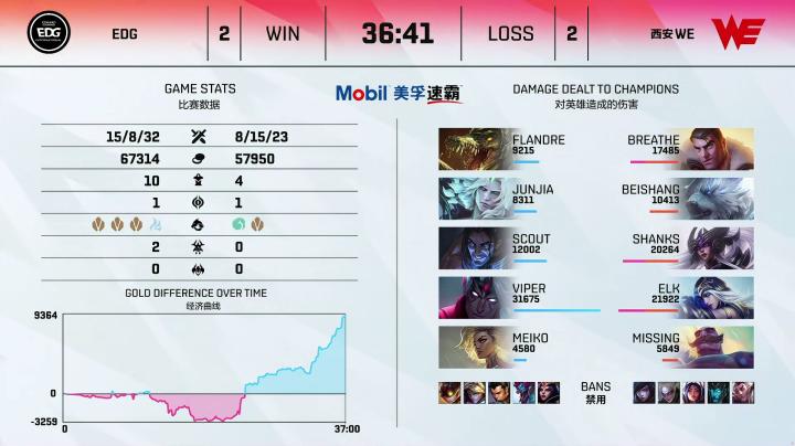 第31分钟,WE拿到远古龙五人抱团推上高地,杰斯伤害爆炸最终团灭EDG,顺利一波结束比赛,恭喜WE!