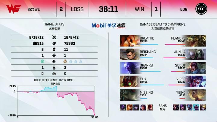 第43分钟,WE带着双龙汇冲上高地,率先秒杀露露,随后团战EDG伤害完全不够,被WE团灭顺利一波结束比赛,恭喜WE!