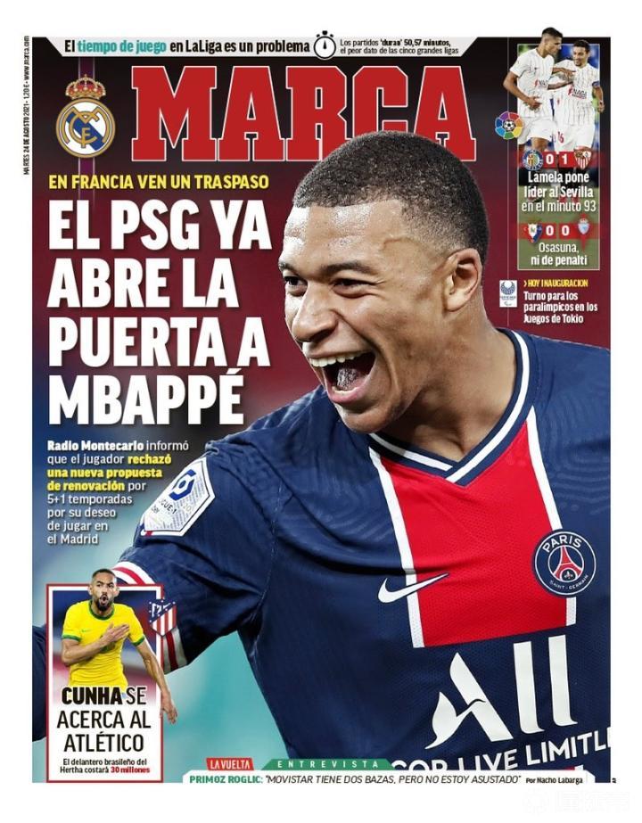 西班牙媒体《马卡报》今日封面为姆巴佩,头版标题为:“巴黎已为姆巴佩打开了大门。”